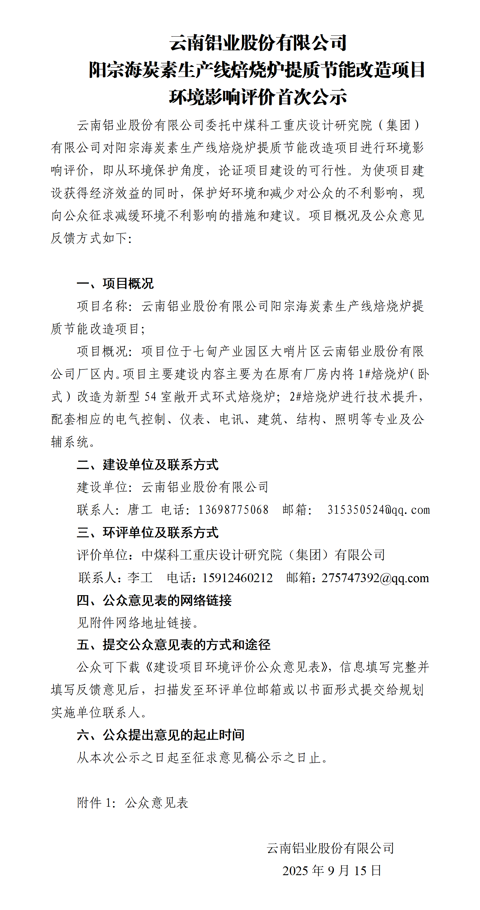 云南铝业股份有限公司阳宗海炭素生产线焙烧炉提质节能改造项目环境影响评价首次公示
