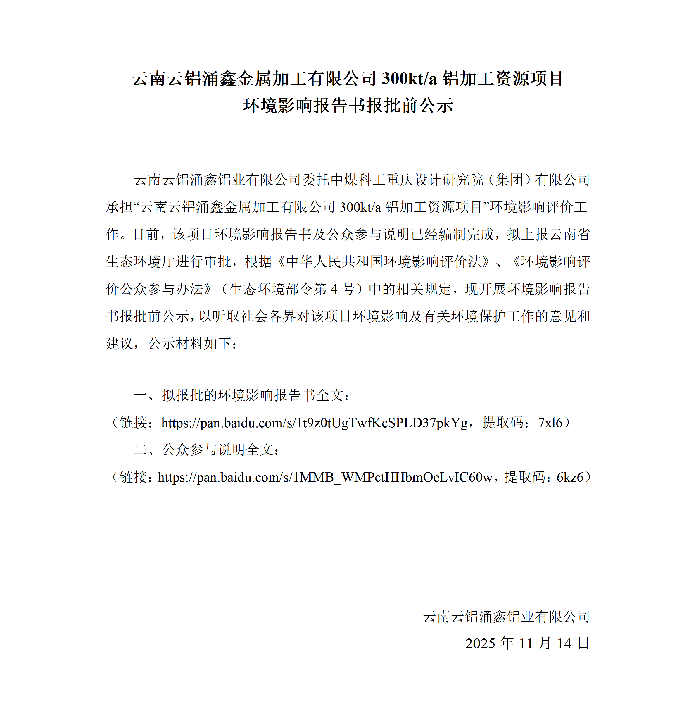 云南云铝涌鑫金属加工有限公司300kt/a铝加工资源项目 环境影响报告书报批前公示